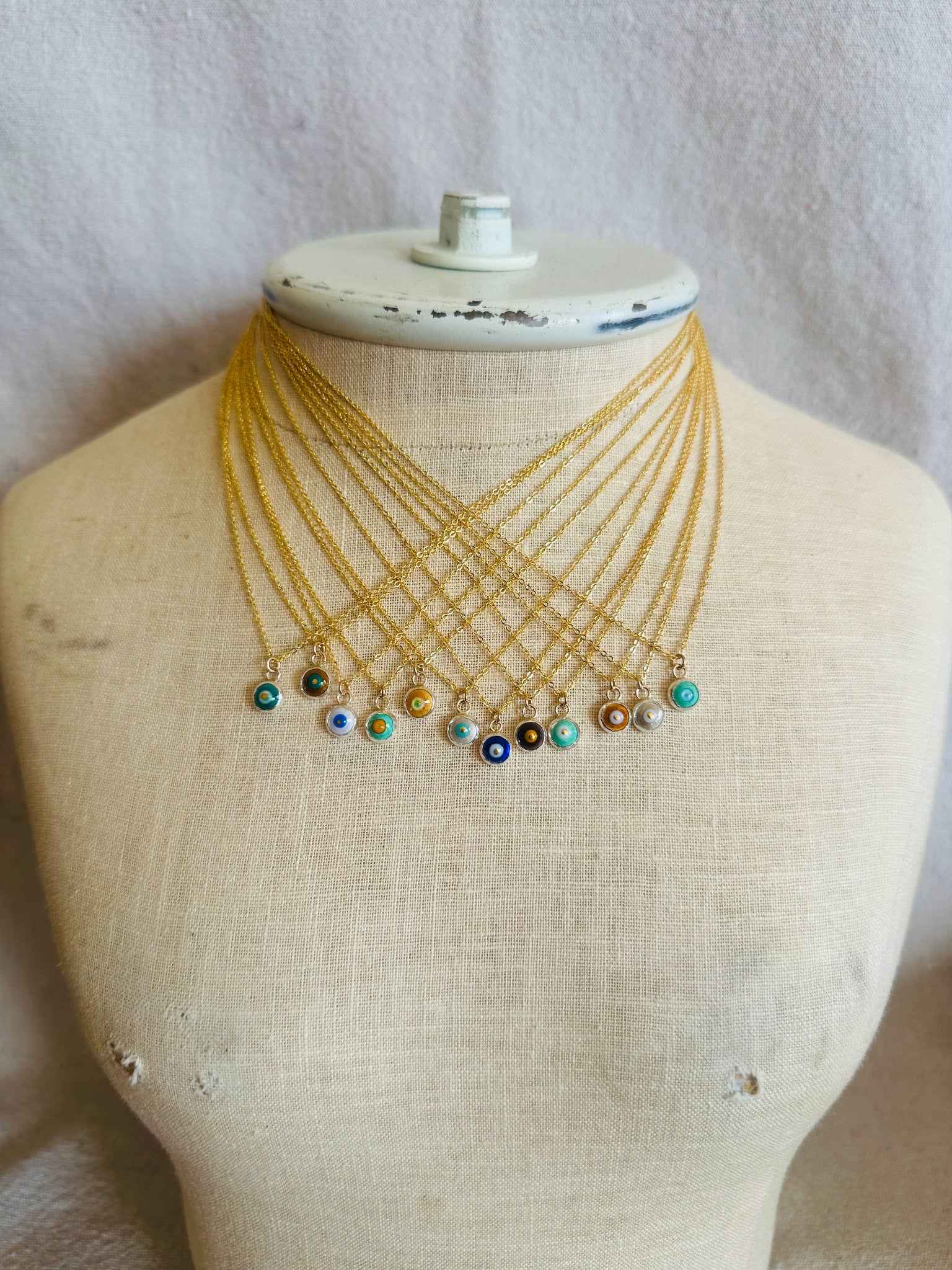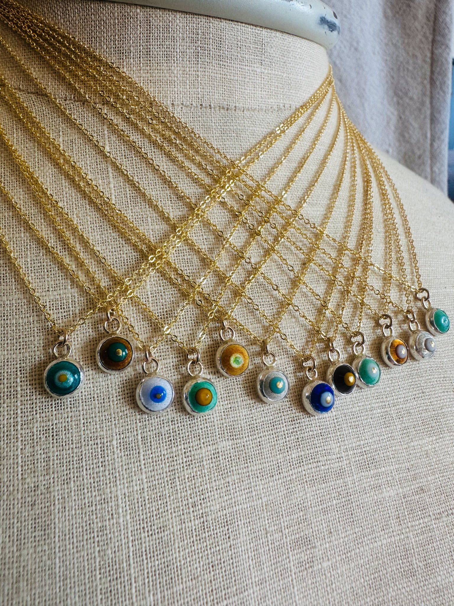 Dainty and powerful, necklaces are crafted in layers of vibrant glass enamel and fine silver, dangling from your choice of chain.